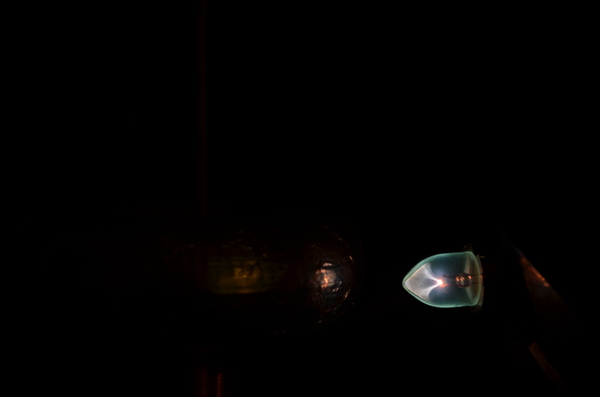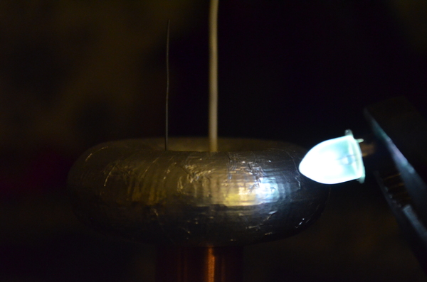 Лампочка фонарика в поле катушки. На очень короткой выдержке, чтобы показать плазму внутри, потому так неярко.
