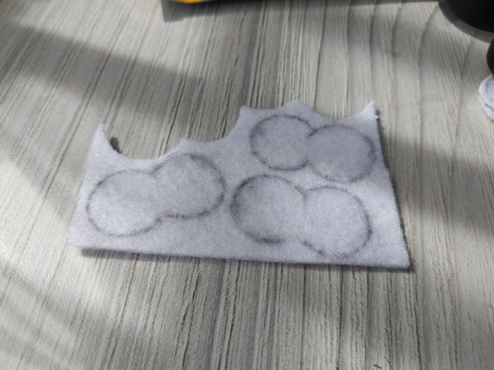 Оформление начинается с глаз. Сначала с помощью трафарета я размечаю их на толстом фетре. Далее вырезаю. Здесь как ни старайся идеально ровно вырезать не получается, поэтому еще какое-то время уходит на корректировку формы тонкими острыми ножницами.