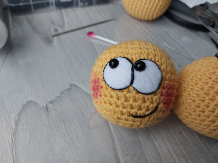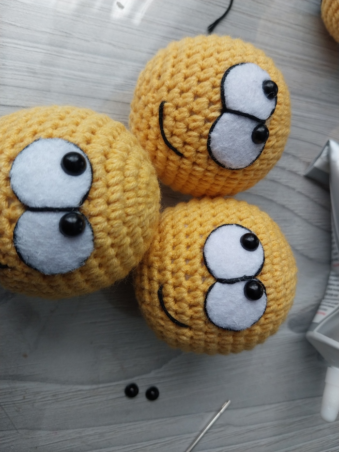Размер каждого смайла 4-5 см. Пряжа акрил+хлопок, наполнитель синтепух. Крупные детали (глаза, рты) из фетра.