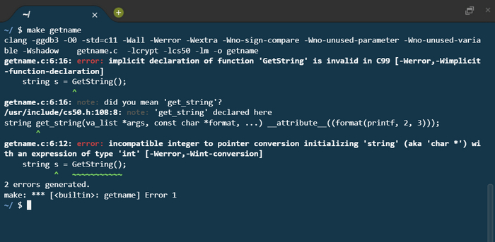 Команда GetString за эти годы превратилась в get_string, если верить мануалу и отзывам других пользователей, проходивших этот курс, которые не смогли повторить эту программу.
