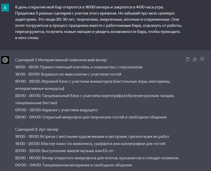 Как результат, я открыл свой бар, сделал шикарное открытие в городе по программе, которую сделала мне нейросеть и получил отличный отклик от посетителей. Использование нейросети позволило мне сэкономить много времени и ресурсов на идеи, которые, возможно, не работали бы. Также я был уверен в том, что мои идеи основаны на данных и фактах, а не на интуиции.
