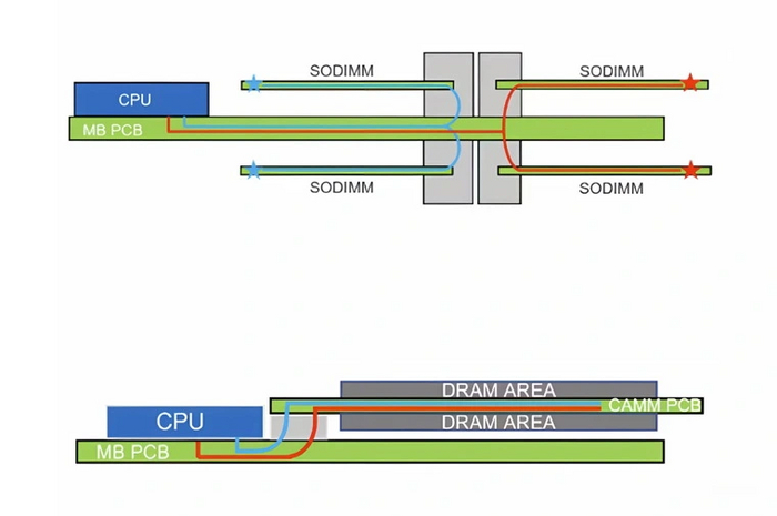 Чтобы обойти эту проблему, было представлено два решения. Первый — появившийся в 2023 году новый форм-фактор памяти CAMM2. Он сокращает длину соединений между ЦП и чипами памяти, значительно уменьшая эти помехи. Есть и еще одно ключевое преимущество: возможность организовать широкий 128-битный доступ к памяти, заменяя одним модулем CAMM2 два модуля DIMM или SO-DIMM.