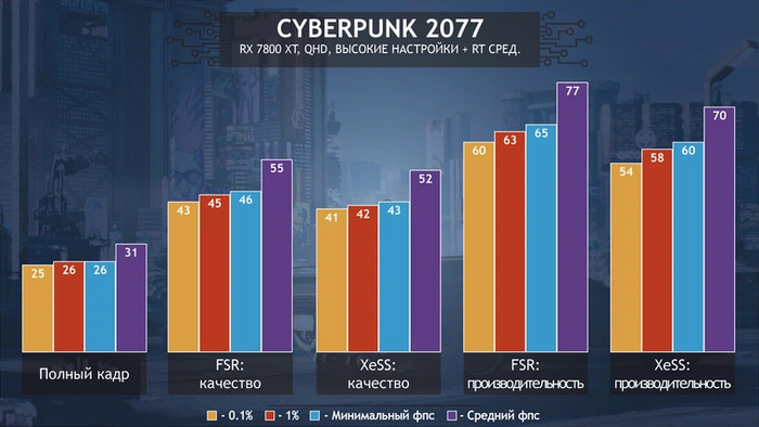 RX 7800 XT и 6900 XT на потерю 1–5 кадров наплевать: в режиме «Качество» все равно можно играть с огромным приростом относительно полного кадра. Но ведь есть карты сильно медленнее 7800 XT и 6900 XT, и для них результаты могут быть совершенно другими.