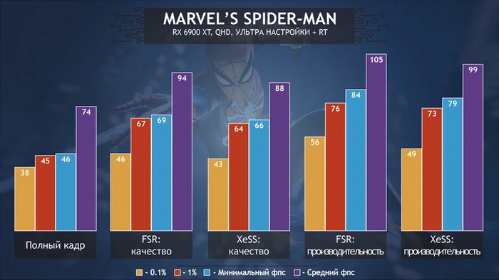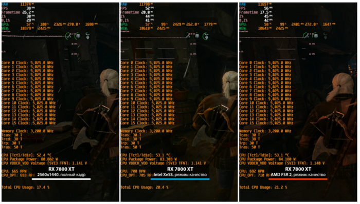 Также стоит заметить, что при одинаковых режимах апскейла XeSS всегда дает чуть меньший прирост кадров, чем FSR. Видеокарта в случае технологии Intel не только обрабатывает графику, но и обеспечивает работу ИИ-модели. Производительность в таком случае просто обязана быть ниже: это не недостаток, а закономерность.