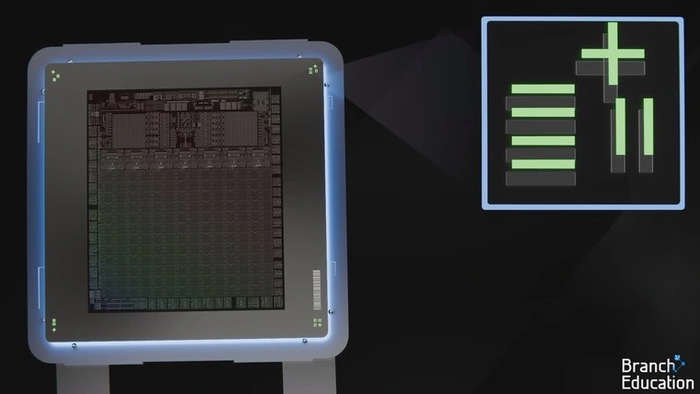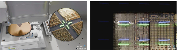 С помощью системы зеркал рисунок от маски масштабируется, попадая на кремниевую пластину в уменьшенном виде. Каждая маска может содержать от одного до нескольких шаблонов будущих чипов — это зависит от их размера. Например, на ней поместится один крупный графический процессор, два менее габаритных центральных процессора, или сразу 12 чипов оперативной памяти.