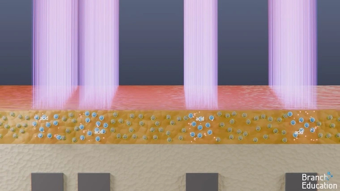 Напоследок расскажем, как устроен фоторезист. Он представляет собой синтетическую смолу, смешанную с фоточувствительным органическим красителем — сенсибилизатором. Когда фотоны EUV-света попадают на смолу, высвобождаются электроны с высокой энергией. Под их воздействием сенсибилизатор превращается в кислоту, делающую структуру смолы слабее.