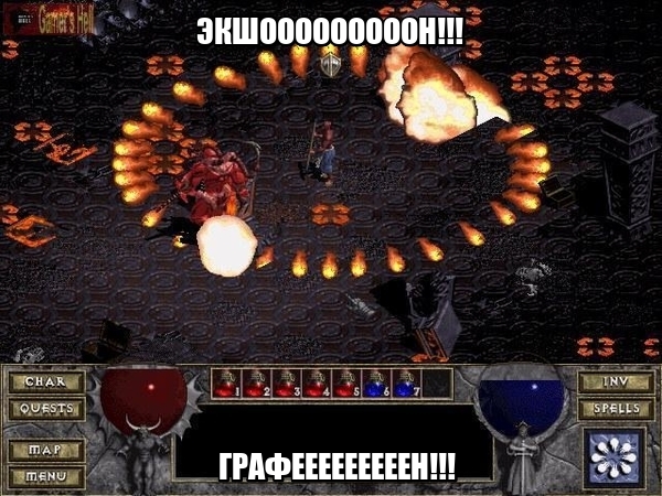 - Ну и короче, мы так подумали подумали, и Абаддон такой: "Только не RTS, задолбали RTS, давайте че-то новое сделайте, где кровища, где махач, ну чтобы там тупое мясо, но не shooter, не как DOOM, DOOM наш старый проект, уже пованивает", и тут ему за DOOM Вельзевул прямо в пятак и съездил, да орет еще такой: "ЗА DOOM И АДСКИЙ ДВОР КОЛЮ ВИЛАМИ В УПОР!!!", вот так и родилась идея сделать hack-n-slash. -