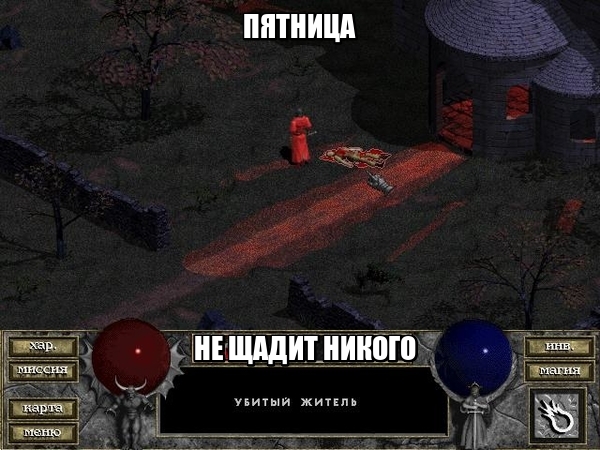 - Значит, слушай сюда, Аластор, мне нужны имена, явки и пароли тех ваших сотрудников, что участвовали в создании Diablo. Помнишь такую игру, жирный ублюдок, помнишь?!! ПОМНИШЬ?!! ГОВОРИ!!! *Бьет Аластора кадилом по щеке* -