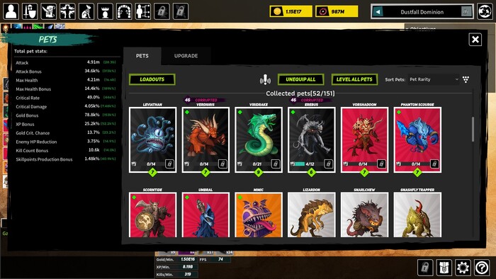 👍 Шикарная глобальная прогрессия по множеству параметров: петы, герои-помощники, снаряжение, проклятый амулет, кузнец, тренер и так далее. Собственно, вся игра из этого и состоит.