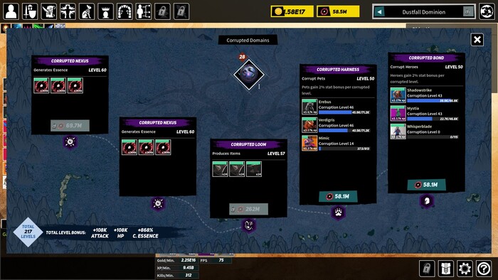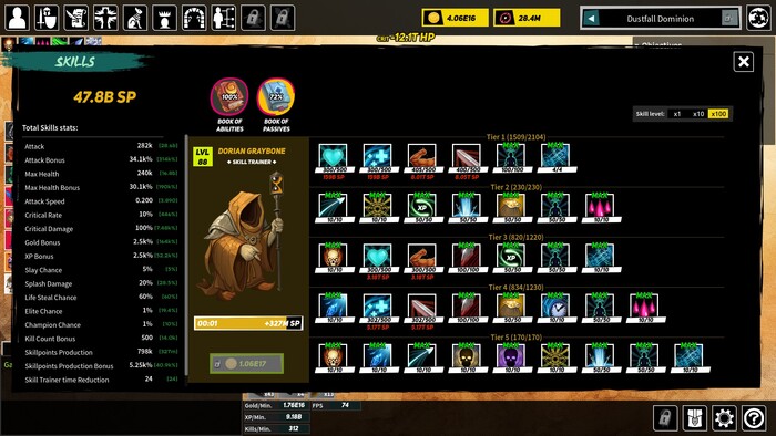 В какой-то момент, который я не уловил, герою выпадает странный амулет. Он даёт ещё одно дерево прокачки. Отследить событие можно по появлению новой шкалы ресурса, рядом с золотом. Если по этой шкале щёлкнуть, то новое окно развития и откроется.