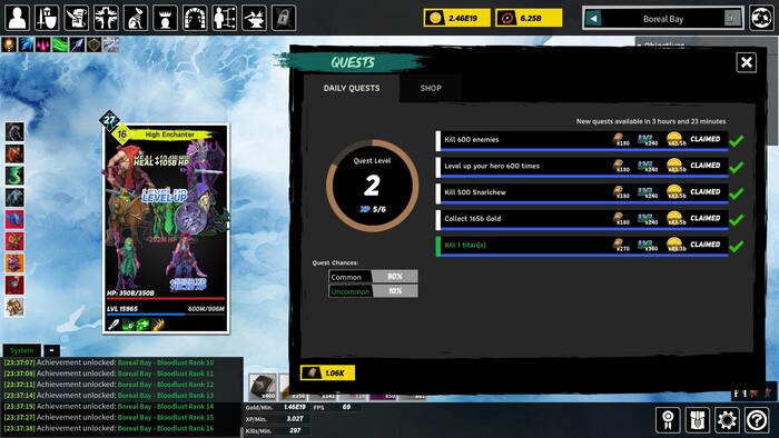 Из интересного. В какой-то момент становятся доступны сайд-квесты. По сути, это заряжание маны в некие шкалы действий. Когда квест будет закончен, то дадуит награды — предметы экипировки или несколько десятков душ. Судя по ачивкам, в конце всех сайд-квестов поджидает какая-то мощная награда. Но для этого всю регулярную игру из 100 уровней надо пройти.
