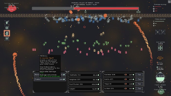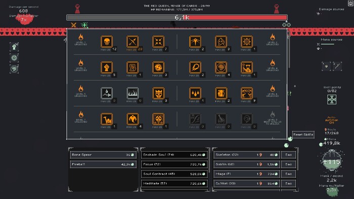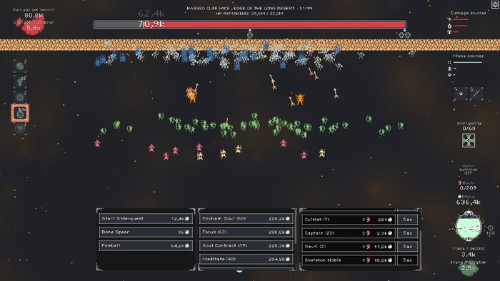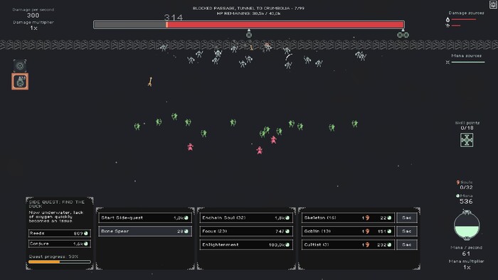 Для решения задачи со стеной у нас постоянно накапливается мана. Тратим её на вызов боевых и вспомогательных существ, кастование заклинаний, получение пассивных и активных усилений, выполннение сайд-квестов и так далее.