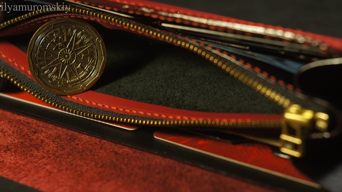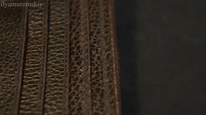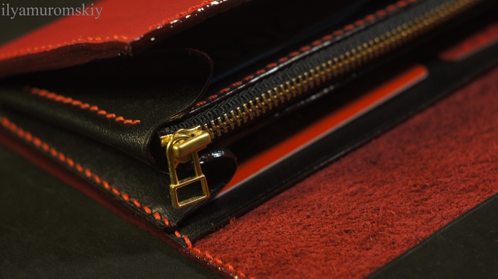 По-началу была идея кошелька с круговой молнией, но кожа, которая пошла на обложку оказалась слишком мягкой, чтобы уверенно держать такую форму, а усиливать картонками не наш метод.
