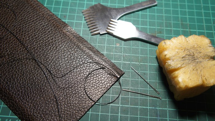 Шил с помощью косого пробойника, шила и кручёной нити ф0,65 мм.