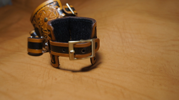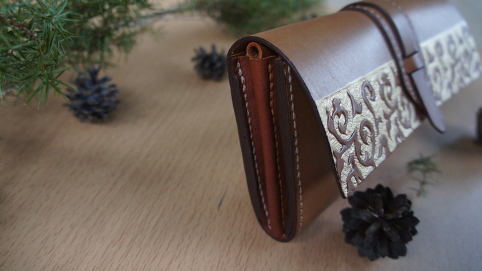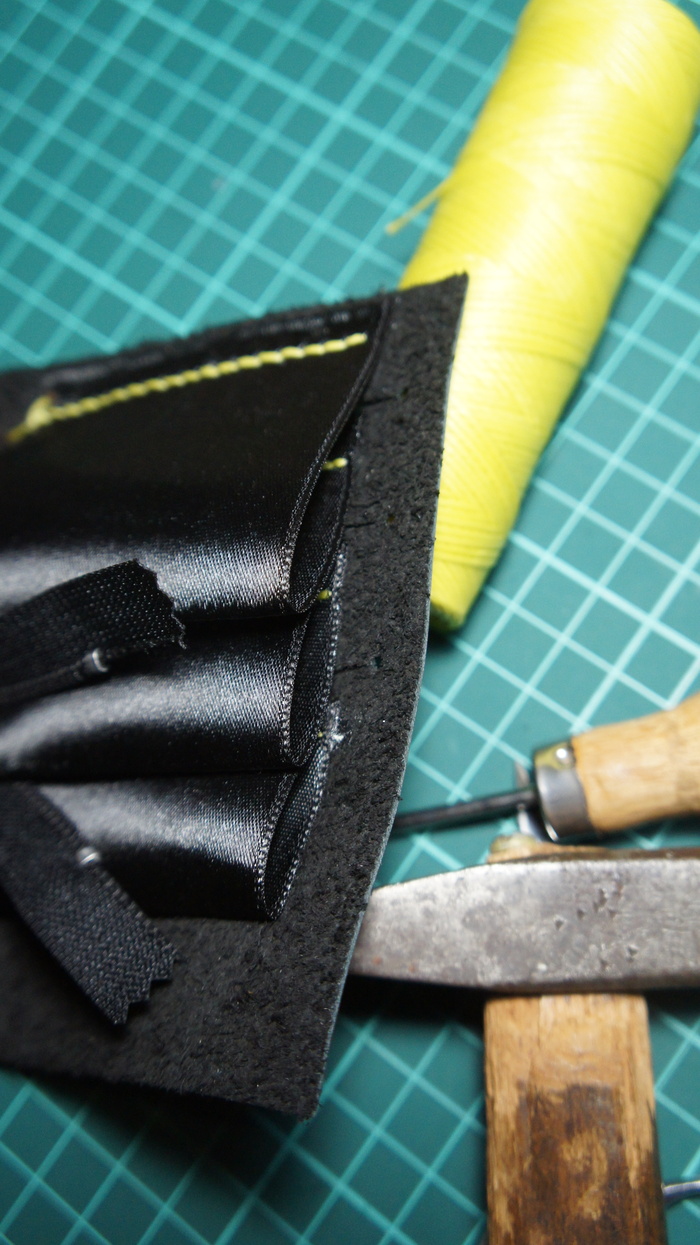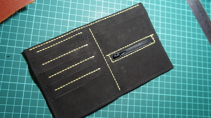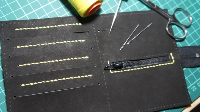 5. Вырезал деталь из тонкой подкладочной кожи, пробил симметрично отверстиям в нубуке и сшил промежуточные швы, закрыв и сформировав таким образом нутро кармашков.