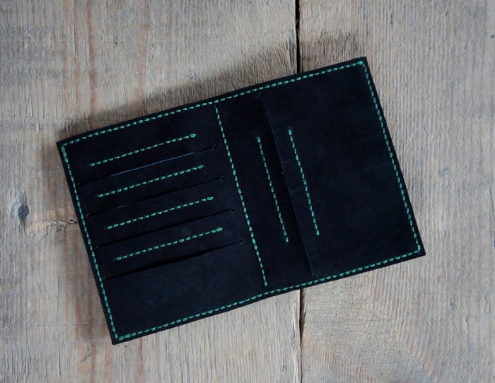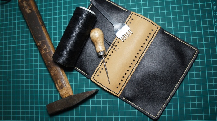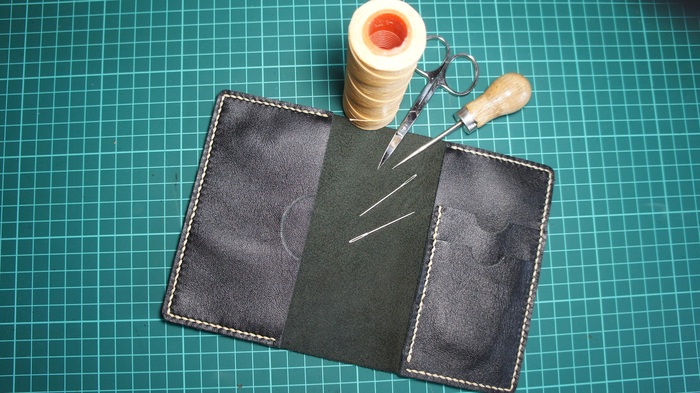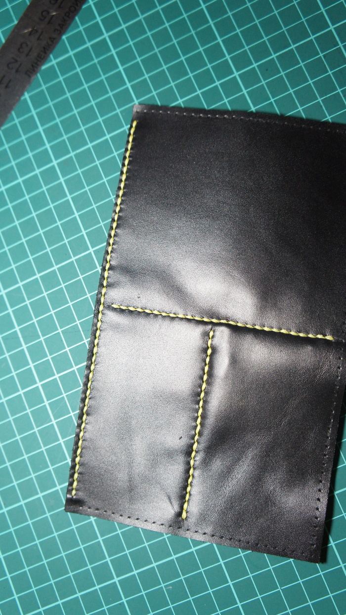6. Всё, что остаётся, это вырезать ещё одну деталь на внешнюю обложку. Брал наппу, хороший вид, износостойкость, не склонна к заломам, царапинам и впитыванию влаги. Пробиваем часть периметра и сшиваем.