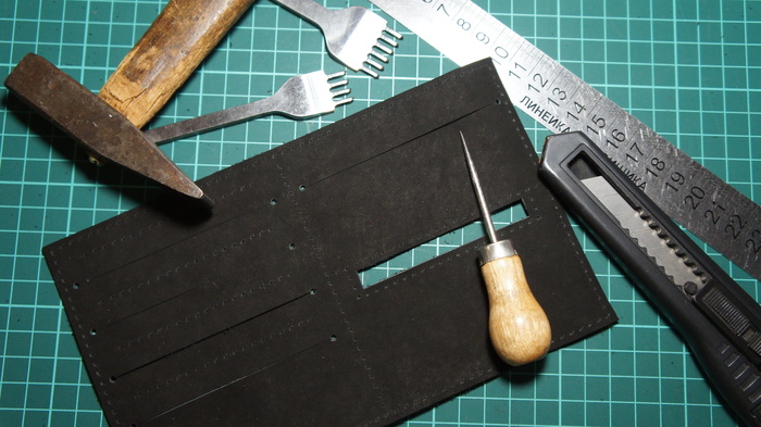 2. Далее разметил будущие кармашки для карт, прорезал ножом, пробил на концах отрезков отверстия, это предохранит кожу от разрыва. Пробойником разметил будущие строчки швов.