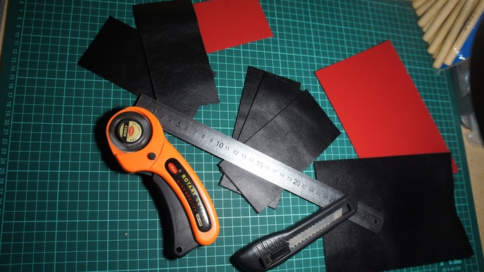 1. Для внутренней стороны выбрали черный нубук. Приятный на вид и на ощупь, подобие мелкой замши. Выкроил первую деталь.