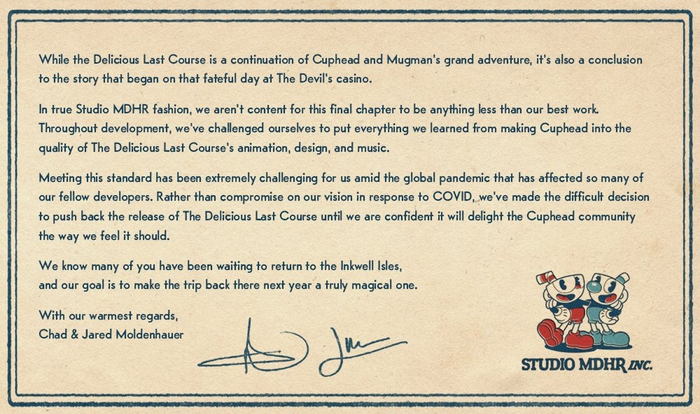 Студия MDHR снова перенесла релиз дополнения The Delicious Last Course для хардкорного платформера Cuphead. DLC выйдет на PC, PS4, Xbox One и Nintendo Switch в 2021 году.