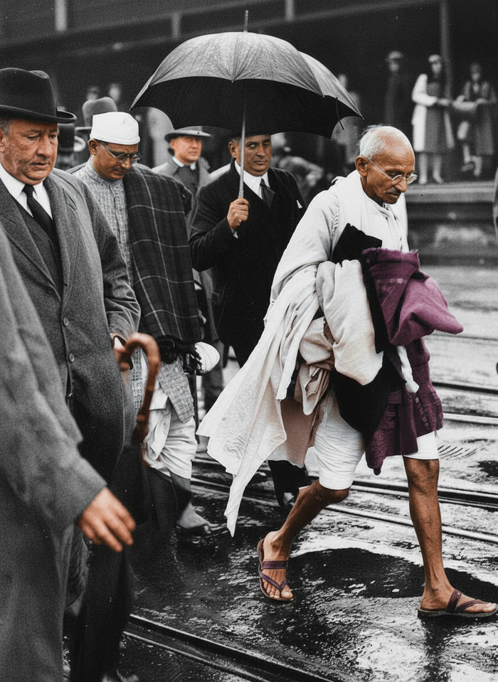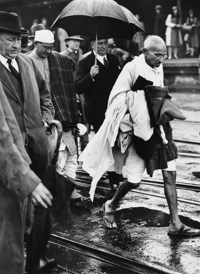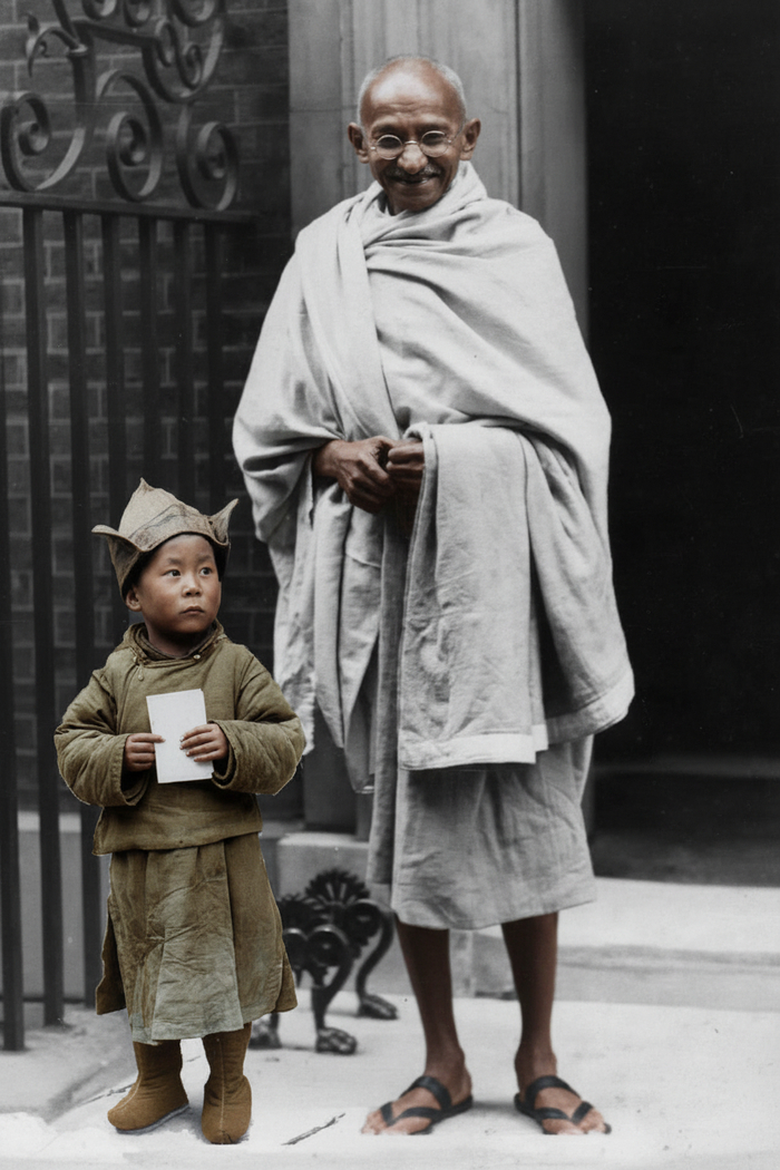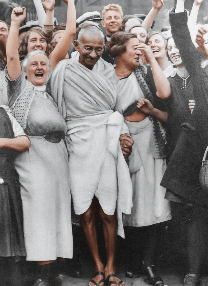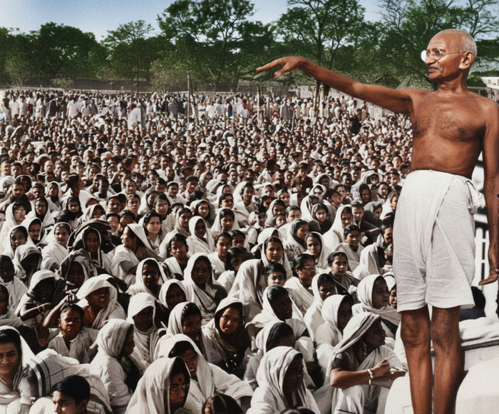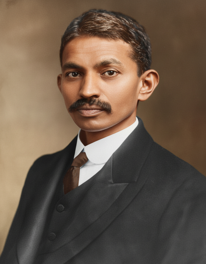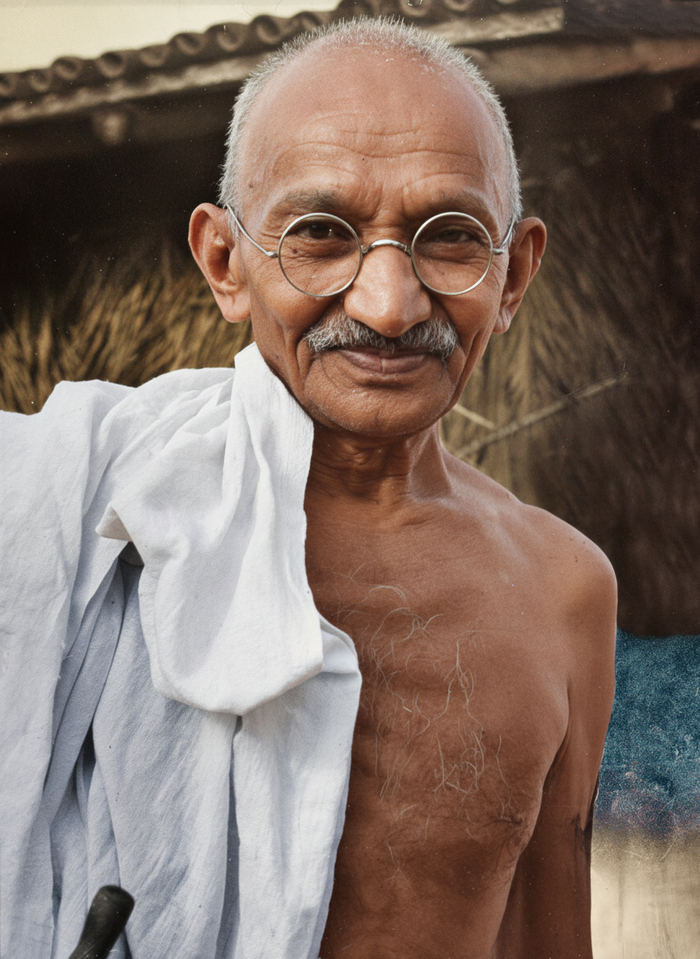 Махатма Ганди (1869–1948) — индийский политический и духовный лидер, основоположник движения ненасильственного сопротивления (сатьяграха). Он сыграл ключевую роль в борьбе Индии за независимость от Британской империи, пропагандируя мирные методы протеста, гражданское неповиновение и этические принципы жизни.