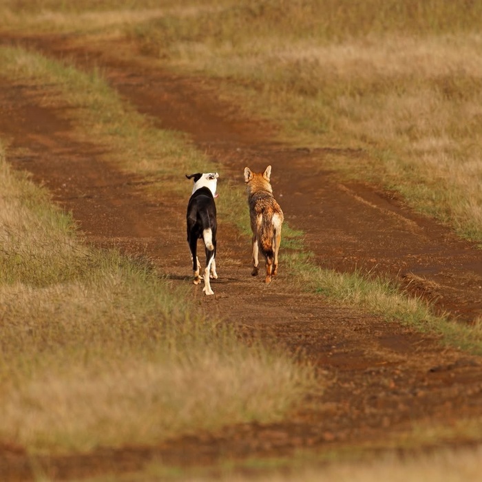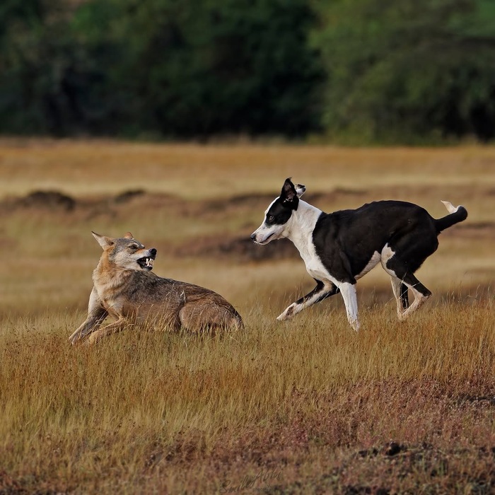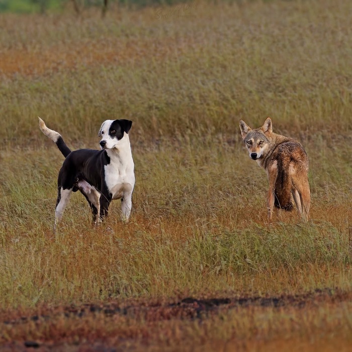 Осматривая луга, я стал свидетелем чего-то поистине неожиданного — редкого взаимодействия между домашней собакой и самкой индийского волка.