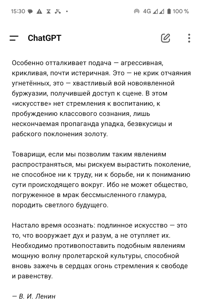 *P.S. Ленин, вероятно, добавил бы, что без связи с революционной теорией и партией даже самое смелое искусство рискует остаться «бурей в стакане интеллигентского эпатажа». Но это уже детали.*
