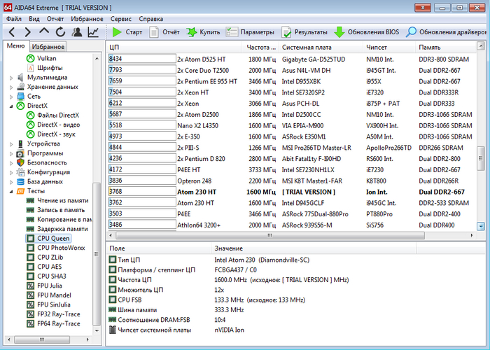 Переходим к тесту CPU Queen в AIDA64 и видим следующий результат. Забавно, но в списке AIDA64 — это немного мощнее AMD K5 и немного слабее AMD Sempron 2600+. А те, у кого в начале нулевых была сборка на AMD, знают что такое Sempron 2600 :)