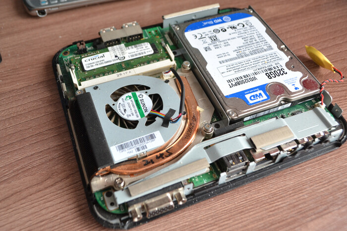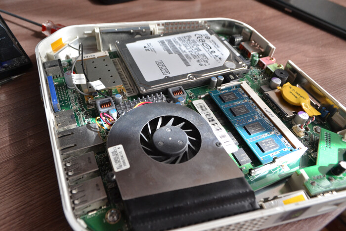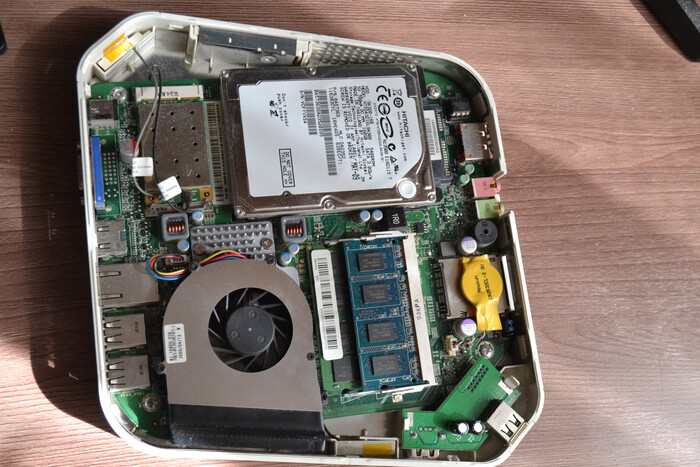 Под капотом устройство собрано не менее интересно. Оба проца и память находятся на одной-единственной маленькой плате с плотностью элементов… ну вполне на уровне Mac Mini как минимум.