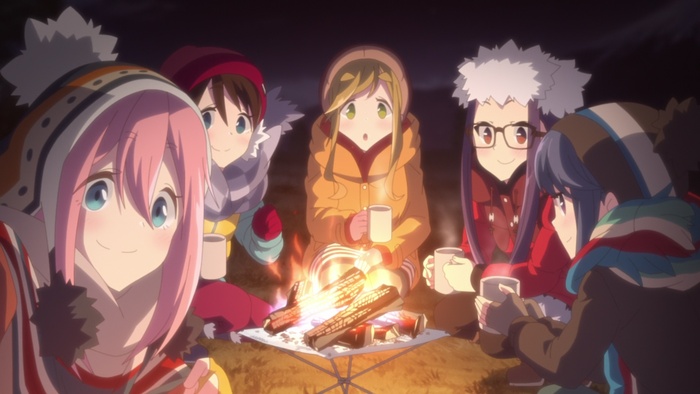 Ну и третье, это как уже было сказано атмосфера. В основном, от аниме ждешь того же, что и от K-on - вот сейчас достанут тортики и будут за чайком всё обсуждать. Хоть девушки тут едят жаренную кукурузу, и пью горячий чай в термосах, атмосфера аниме "веет" исключительно тем, как создатели подошли к тематике похода в горы. Не только прорисовкой палаток, снаряжения, но и тем что учат какие именно вещи можно делать, а какие нельзя.