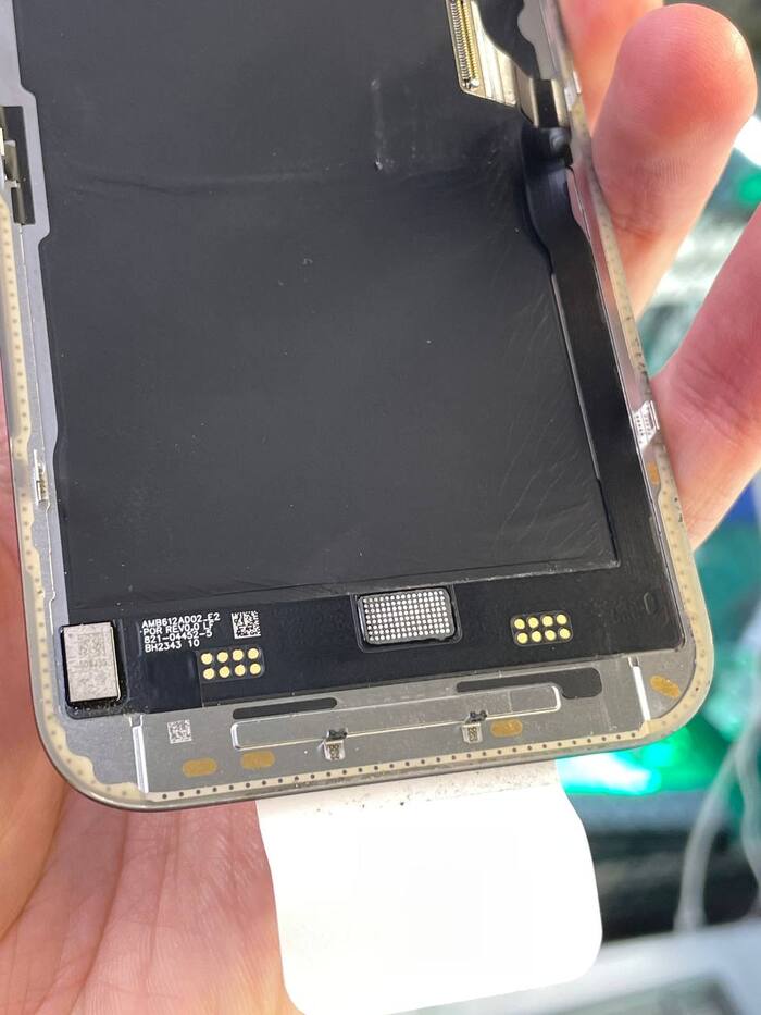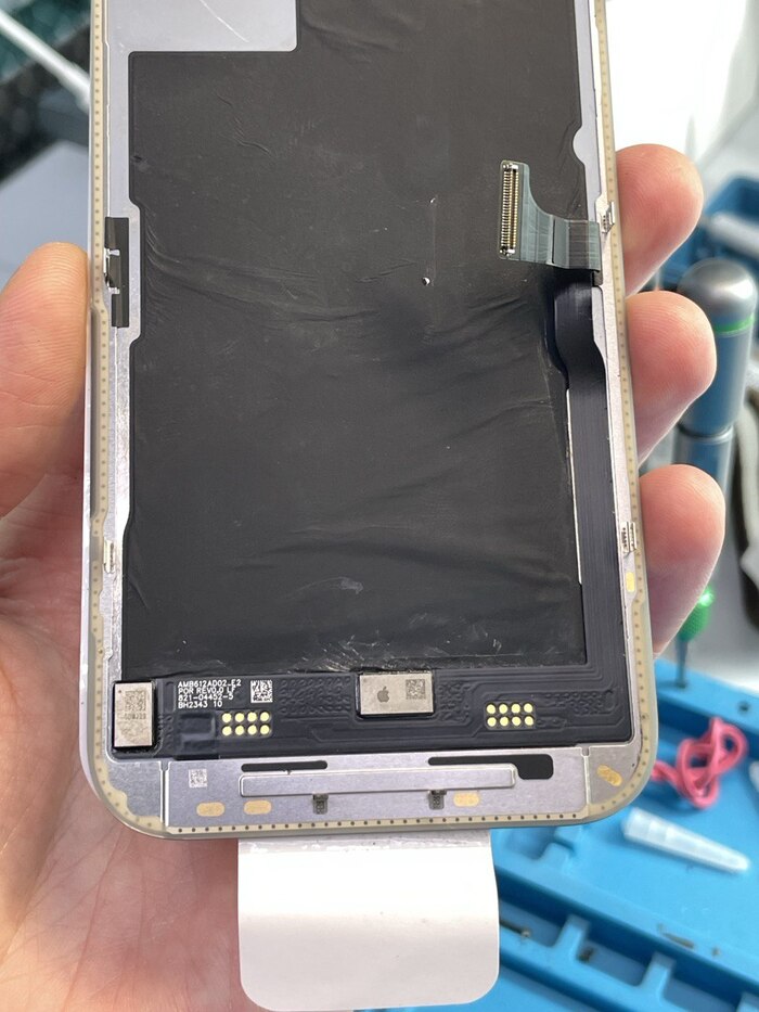 Далее переходим к самому интересному- дисплейному модулю. С версией iOS 18 стало проще: взял сервисный оригинал и привязал его к устройству. Не нужно ничего перепаивать и рисковать дисплеем. Но в истории деталей и обслуживания все равно можно увидеть, что дисплей менялся, хоть и на оригинал. А цена такого дисплея будет дороже снятого б/у в идеальном состоянии. Решено взять снятый оригинальный экран и перекинуть на него микросхему, чтобы следов ремонта вообще не было.