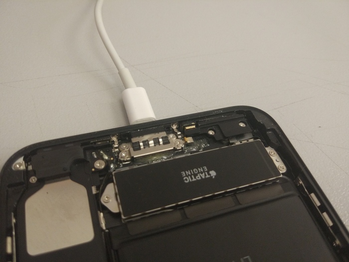 Откинув дисплейный модуль, видим, что собачка своими зубками добралась ещё и до пластика нижнего шлейфа. Такой шлейф нам не подойдёт, меняем его на оригинальный целый. Так же меняем кнопку на оригинальную и производим процедуру коммерческой замены iPhone 7 Plus.