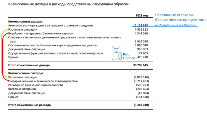 Доходы по расчетным операциям (+7 млрд) нивелируются расходами на расчетные расходы (-5 млрд), чуть-чуть остается. Эквайринг (+4,3) – расходами на IT (-3,3). Наибольший доход приносят страховки. Причем не ОСАГО, КАСКО, а страховки к кредитным продуктам. Нет кредитов – нет страховки. Так это точно комиссионный бизнес? Скорее выведенный за рамки кредитного договора дополнительный кредитный сбор.