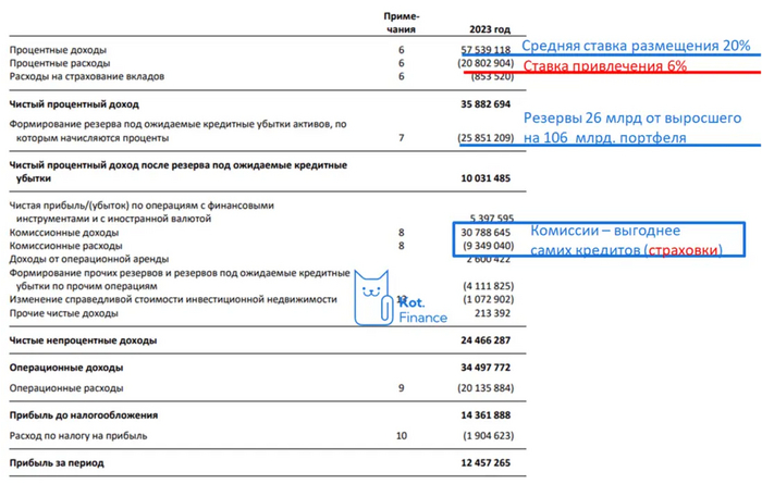 Основной доход – по классике: от кредитов. Вот только почти половину процентных доходов съедает резервирование. Смущает, что при приросте портфеля на 106 млрд, в резерв уходит 26.