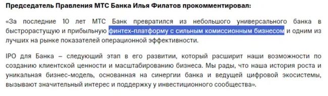 МТС Банк позиционирует себя, как финтех-платформу и комиссионный бизнес.