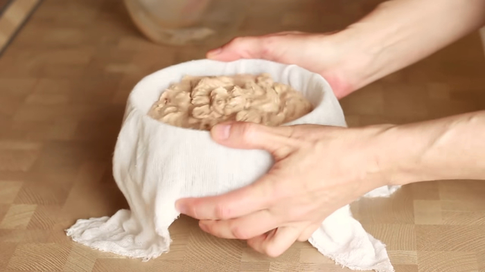 В сито или дуршлаг постелить марлю и переложить туда творожную массу.