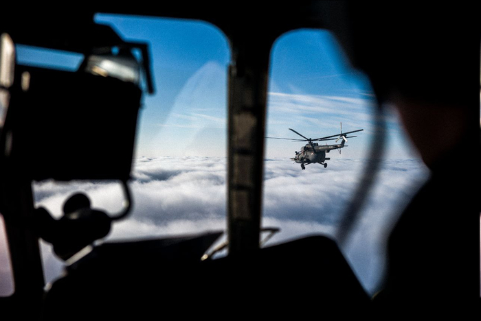 В списке вещей, которые я никогда и никому не буду рекомендовать — это снимать зимой, высунувшись из открытой двери летящего Ми-8. Крошечные снежинки, словно хирургическим скальпелем, режут меня по открытым участкам кожи. Благо из открытых только глаза да кончик носа, добротно смазанный «Бархатными ручками».