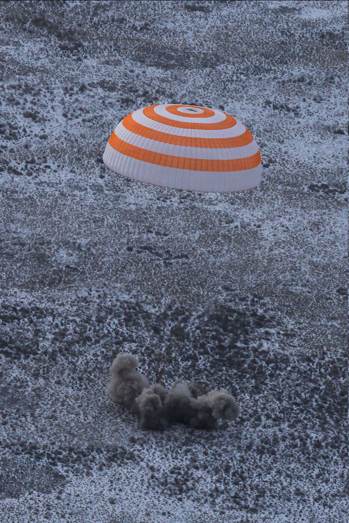 Мы подлетаем ближе и — есть касание! На долю секунды показалось пламя, и столб пыли и вывернутой клочьями земли от сработавших ДМП заслонили аппарат. Рядом медленно приземлилась оранжевая «медуза» парашюта. Мы — единственный вертолёт, кто видел касание аппарата с воздуха, и были первыми, кто подошёл к СА. Огромное спасибо экипажу вертолёта за проявленный профессионализм!