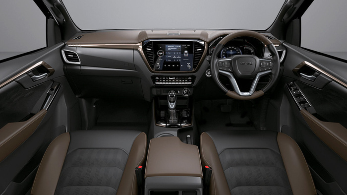 Точечные изменения есть и в салоне. Теперь у него новая приборная панель с семидюймовым цветным экраном по центру и бумерангами шкал по бокам. Под экраном мультимедийной системы (он может иметь диагональ 8 или 9 дюймов) в зависимости от комплектации появились две рукоятки изменения громкости и переключения радиоволны (прежде там были кнопки). Компания Isuzu также утверждает, что применила улучшенные материалы обивки сидений и отделки дверных панелей.