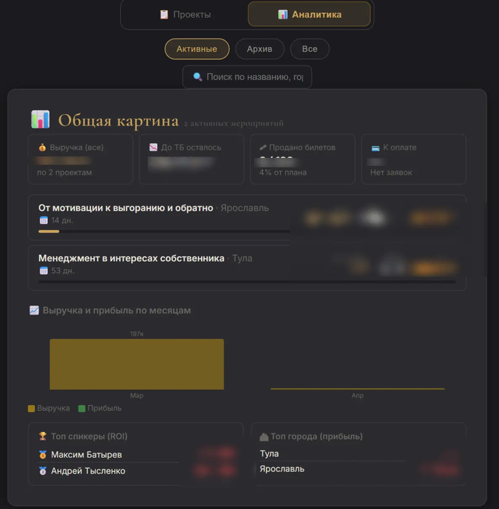 По спикерам: выручка, прибыль, ROI, средний чек, заполняемость зала, NPS. Сразу видно, кто из спикеров системно даёт результат, а с кем мы работаем в ноль.