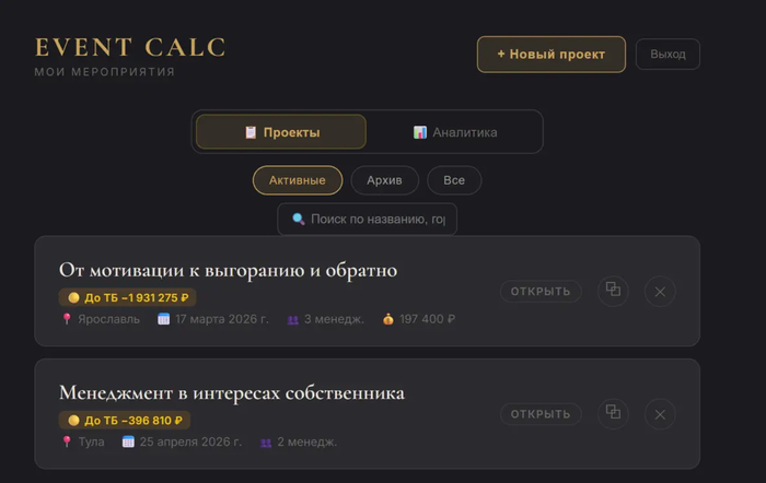 Отдельная вещь, которая сильно экономит время — шаблоны расходов. Настроил типовую конфигурацию один раз, сохранил, и применяешь к каждому новому проекту в один клик. Запуск нового мероприятия перестал начинаться с часового копирования таблиц.