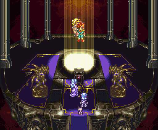 Хроно и девушкам ничего не остаётся, кроме как войти обратно во Врата, через которые попали сюда. Как только они исчезают, Сара накладывает на Врата волшебную печать. Убедившись, что дело сделано, Провидец уходит, а царевна падает на колени в слезах.