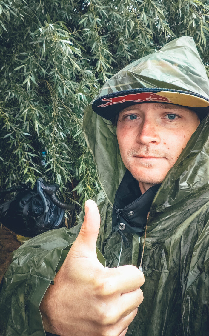 Дождь лил примерно часа полтора, и все бы ничего, но у меня начали замерзать ноги (напоминаю, я был босиком). Чтобы их согреть, я заходил в воду, так как она была гораздо теплее, или подкапывал ноги в песок - снизу он еще не подмок и был теплым. Время шло долго, но так или иначе дождь подуспокоился, но все равно не слабо таки лил. Но, не взирая на дождь, нужно было двигаться дальше. А дальше было самое сложное, по сравнение с чем дождь с градом - всего лишь цветочки. Это размытые напрочь грунты и подъем по нему в холмистый лес. Так уж вышло, что дождь застал меня в самом неподходящем месте, где по маршруту были лес и грунты. Выехал я, кстати, с абсолютно сухими кроссовками. Минуты на 2, пока не заехал в первую лужу.