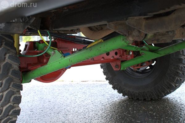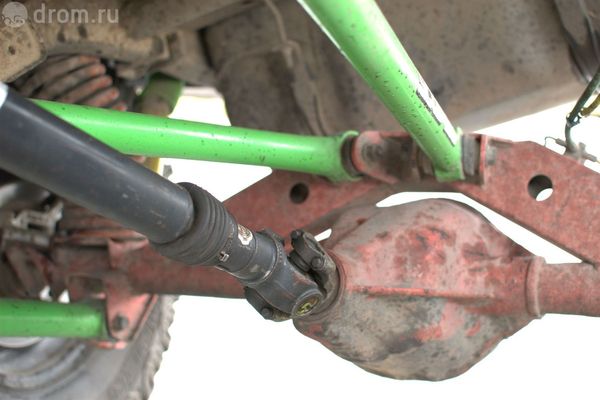 На задний мост наварен усилитель, сам мост немного повернут хвостовиком вверх, поэтому чашки под пружины и крепления амортизаторов пришлось переставить. Усилитель заднего моста заодно служит опорой для двух верхних рычагов задней подвески