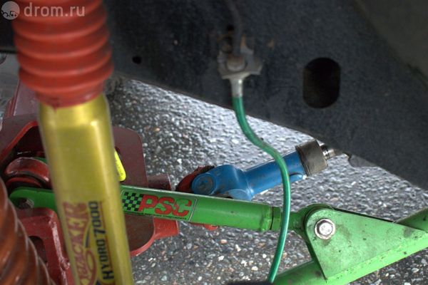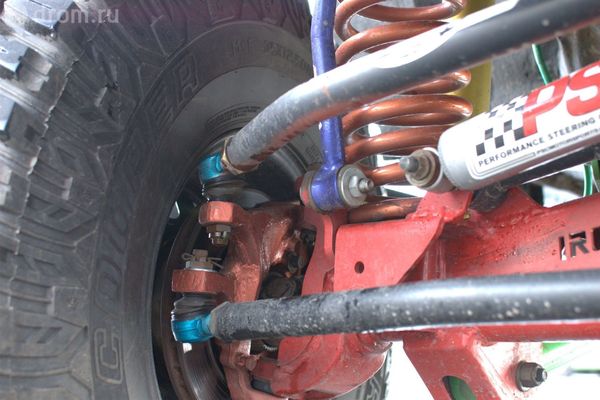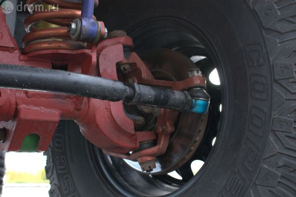 Нижняя рулевая тяга в поворотах задевала за крышку редуктора переднего моста, так что пришлось изготовить выгнутую рулевую тягу из прочнейшей стальной трубы с сечением стенок больше десяти миллиметров. В поворотных кулаках конусные отверстия «развернуты» под размер надежных рулевых наконечников от Mercedes Benz Gelandewagen. Демпфер рулевого управления — от PSC. Ничего не делали только с гидроусилителем, за исключением установки армированных шлангов.