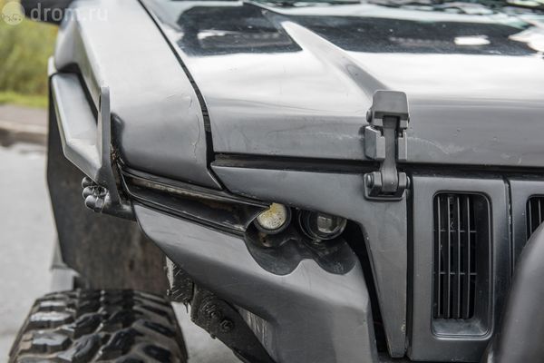 Расширители арок выполнены из яхтенной стеклоткани. Передние колесные арки представляют собой короба из двухмиллиметрового железа, связанные с вваренными в кузов порогами и передними стойками. Жесткость кузова намного выше, чем у стандартного Jeep Grand Cherokee. Лебедка утоплена в передний бампер