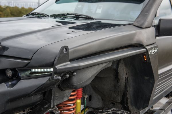 Известно, что Grand Cherokee не отличается жесткостью передней части, на серьезном бездорожье кузов «ходит» так, что трескается лобовое стекло, поэтому в «Гранде» Романа передние колесные арки представляют собой короба из двухмиллиметрового железа, связанные с вваренными в кузов порогами и передними стойками. Передние крылья также защищены силовыми продольными планками. В результате «валить подлесок» можно, не опасаясь повреждений. Шноркель интегрирован в левое крыло и никуда не выпирает.