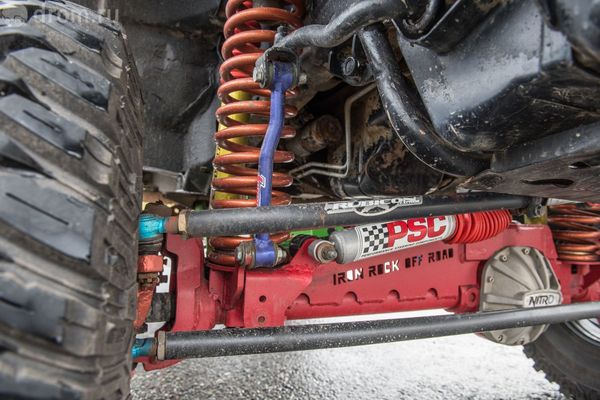 На передний мост от Jeep Cerokee XJ с хвостовиком High Pinion наварен усилитель Iron Rock. Рулевой демпфер PSC. Верхняя и нижняя рулевые тяги расположены параллельно друг другу — «сход-развал» не «уходит». С-образные крепления крестовин — так называемые «цешки» — усилены