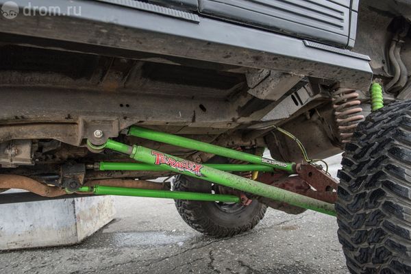 Задняя подвеска на четырех продольных рычагах без тяги Панара не смещается от ударов об ухабы, а это значит, что заднюю часть «Гранда» не «переставляет» даже на самой убитой грунтовке. К тому же огромный ход задней (около полуметра) и передней (около 40 сантиметров) подвески позволяет валить за «сотню» и по вспаханному полю. К тому же «крестятся» мосты так, что одним колесом можно заехать на метровую бетонную тумбу, при этом три других будут прочно стоять на земле. Верхние рычаги через шарнирные крепления соединяются с усилителем заднего моста. Нижние рычаги в стандартных креплениях, а вот чашки под пружины и места крепления амортизаторов пришлось переварить, ведь мост слегка повернут хвостовиком вверх. В качестве упругих и демпфирующих элементов использованы пружины Teraflex и амортизаторы Skyjacker hydro 7000. Эти «аморты» выглядят просто — без выносных бачков, без регулировок — однако очень надежны и отлично отрабатывают как «мелочь», так и крупные неровности.