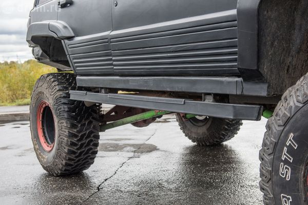 Силовые пороги вварены в кузов. К ним приварены короба, к которым крепятся подножки, выдерживающие подъем автомобиля хайджеком и контакт с препятствием. Крепления подножек сделаны так, что при сильном ударе подножки смещаются в них, не травмируя кузов