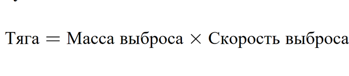 Величина тяги, создаваемая ракетой (или стреляющим пулеметом), зависит от того, (1) какое количество своей массы она выбрасывает, и (2) как быстро она выбрасывает ее. Тяга — произведение этих двух величин.